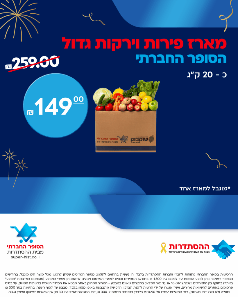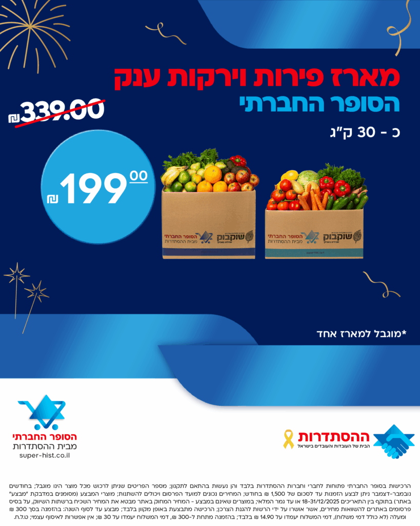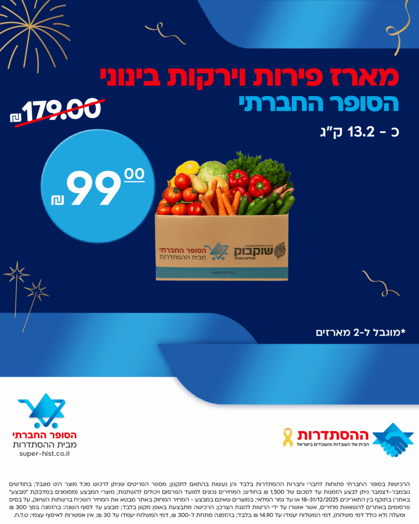 בסופר החברתי מחכים לכם מבצעי סוף שנה שלא תרצו לפספס: מבחר ענק של מוצרים איכותיים במחירים מסובסדים, ומשלוח עד אליכם!